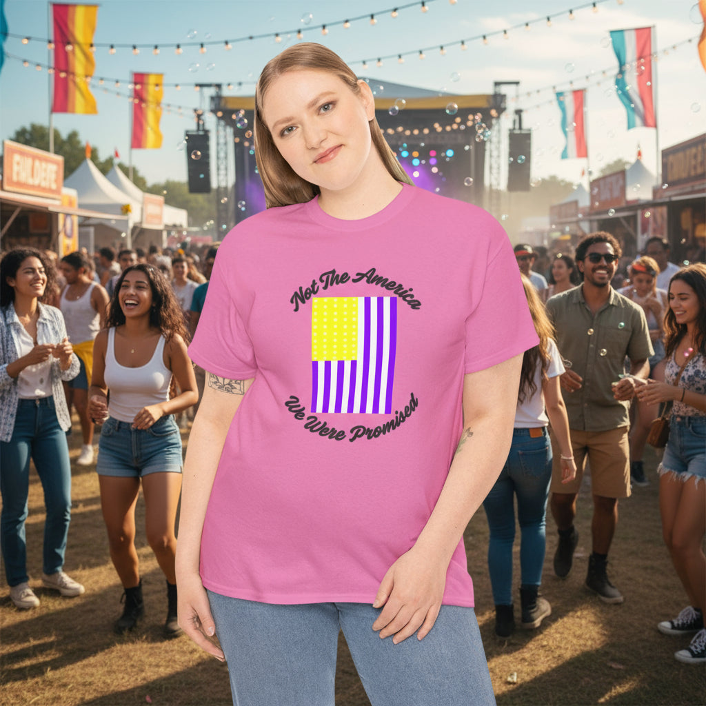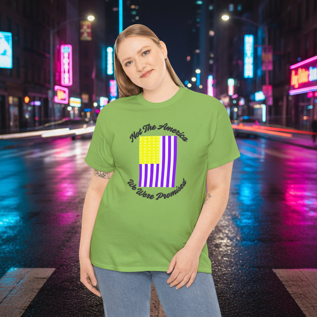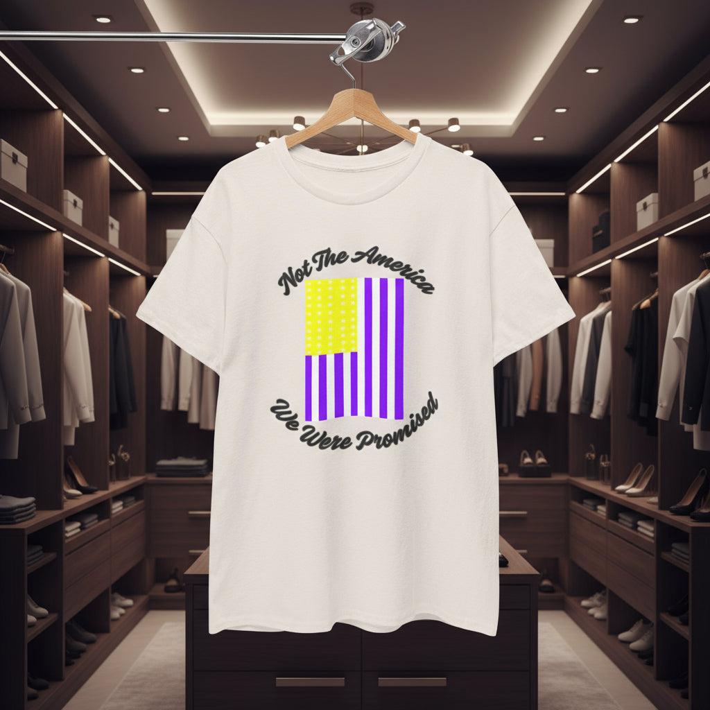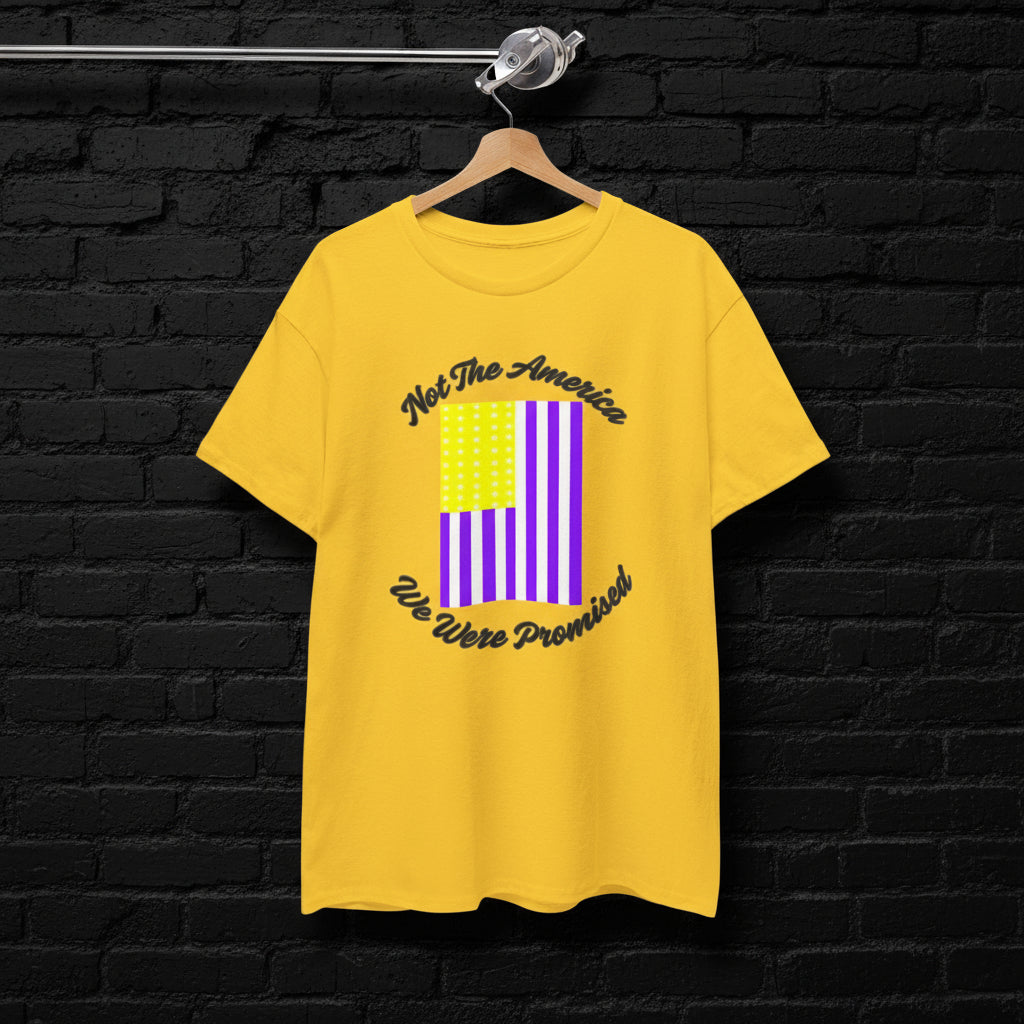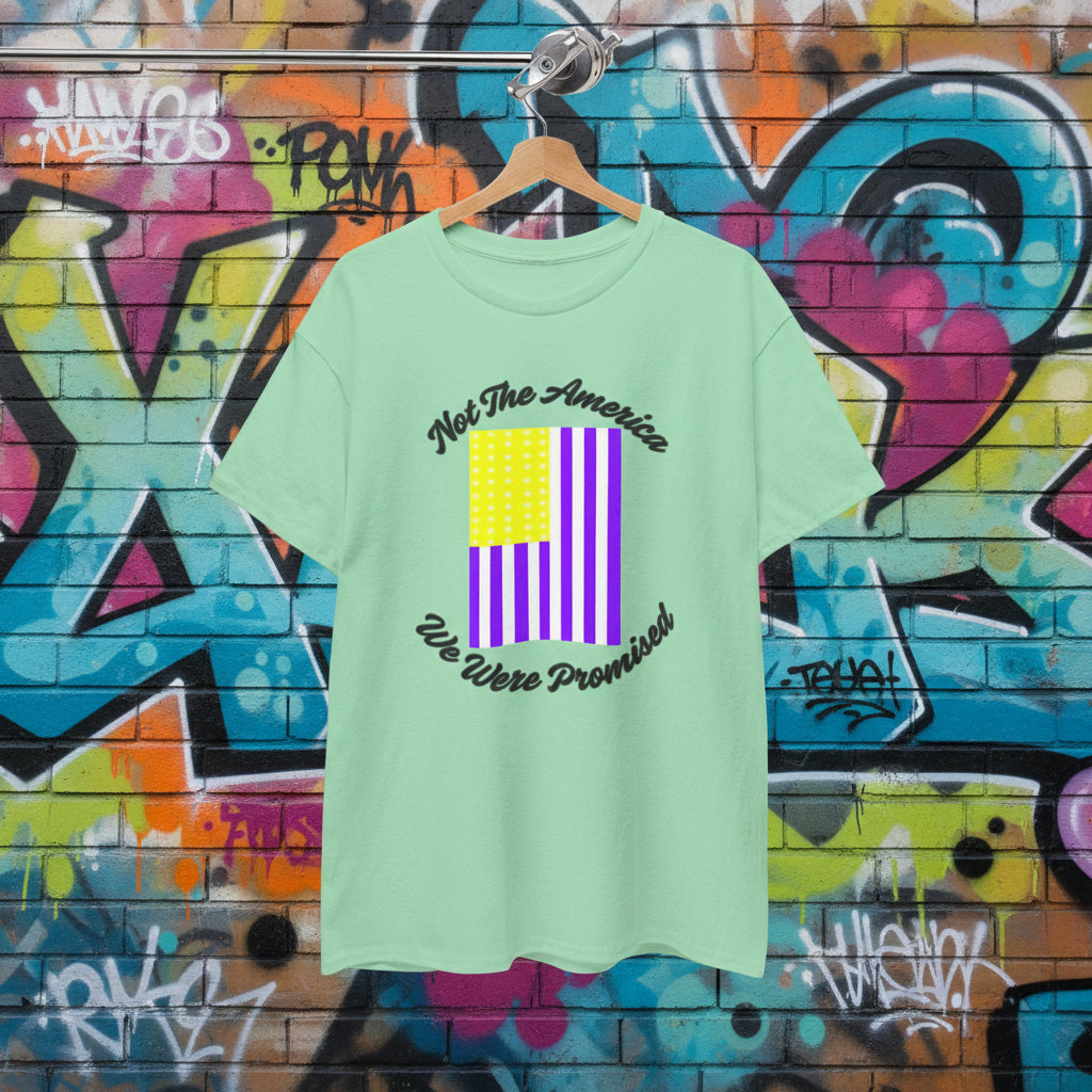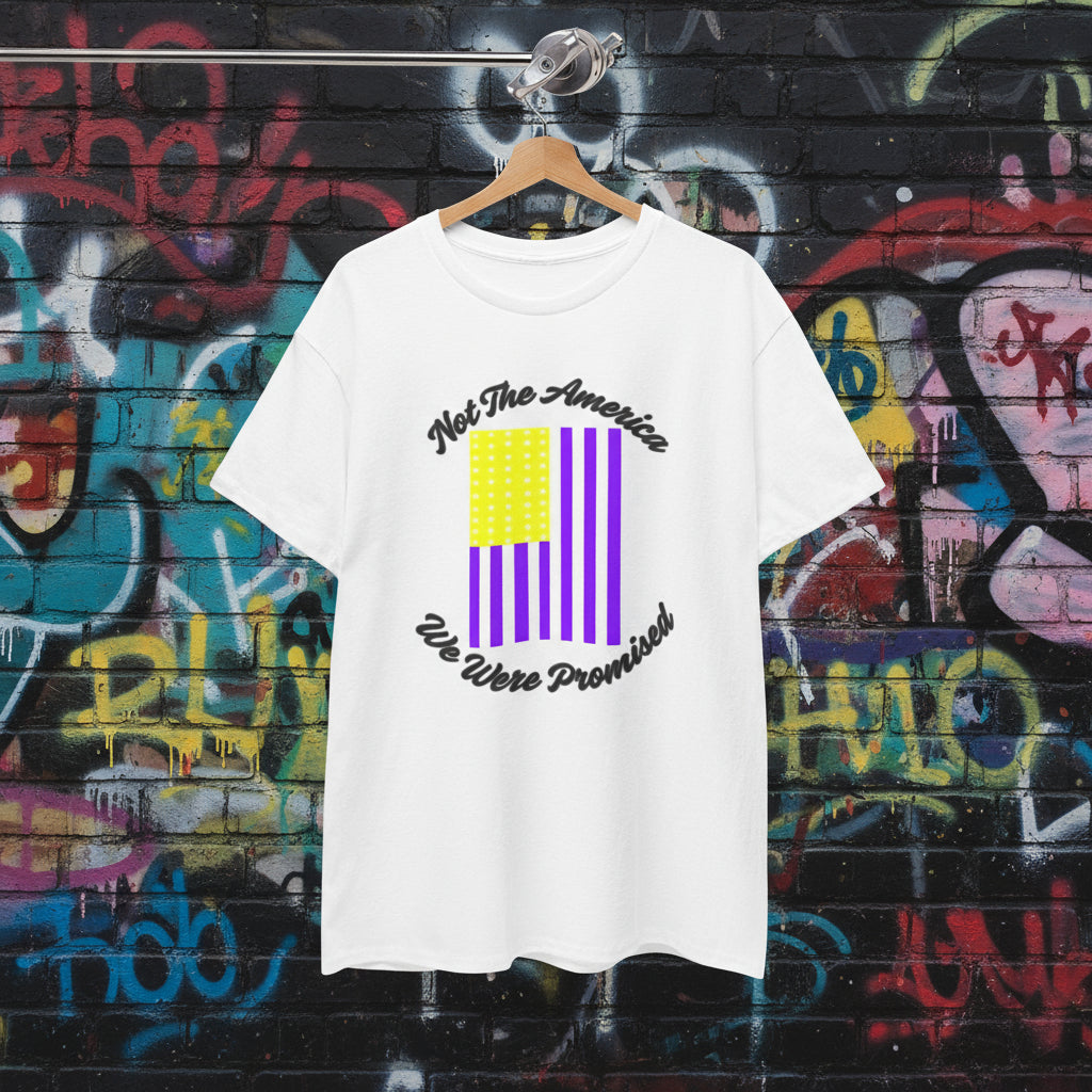 Loud, electric, and unapologetically real. This neon-drenched design screams disillusionment with a dream deferred. 'Not the America We Were Promised' is a fluorescent wake-up call—where bold colors meet bold truth