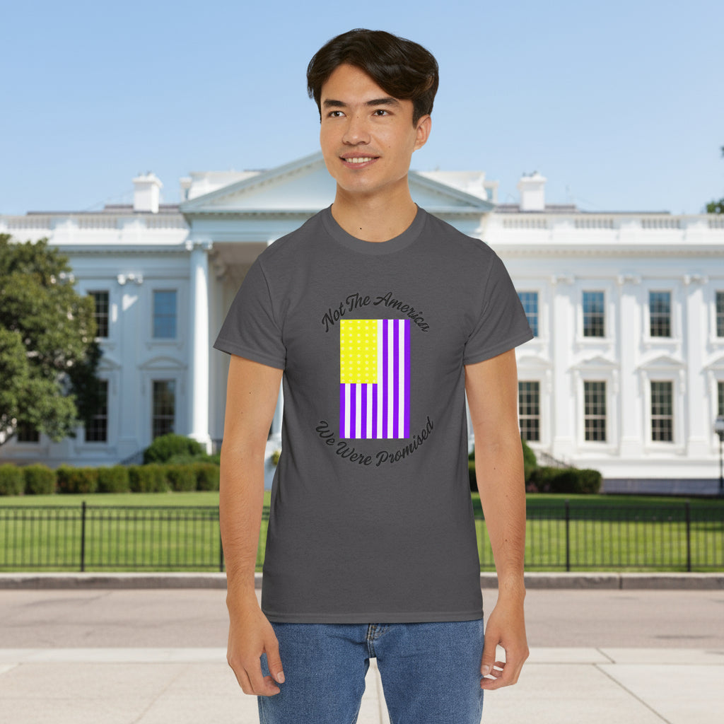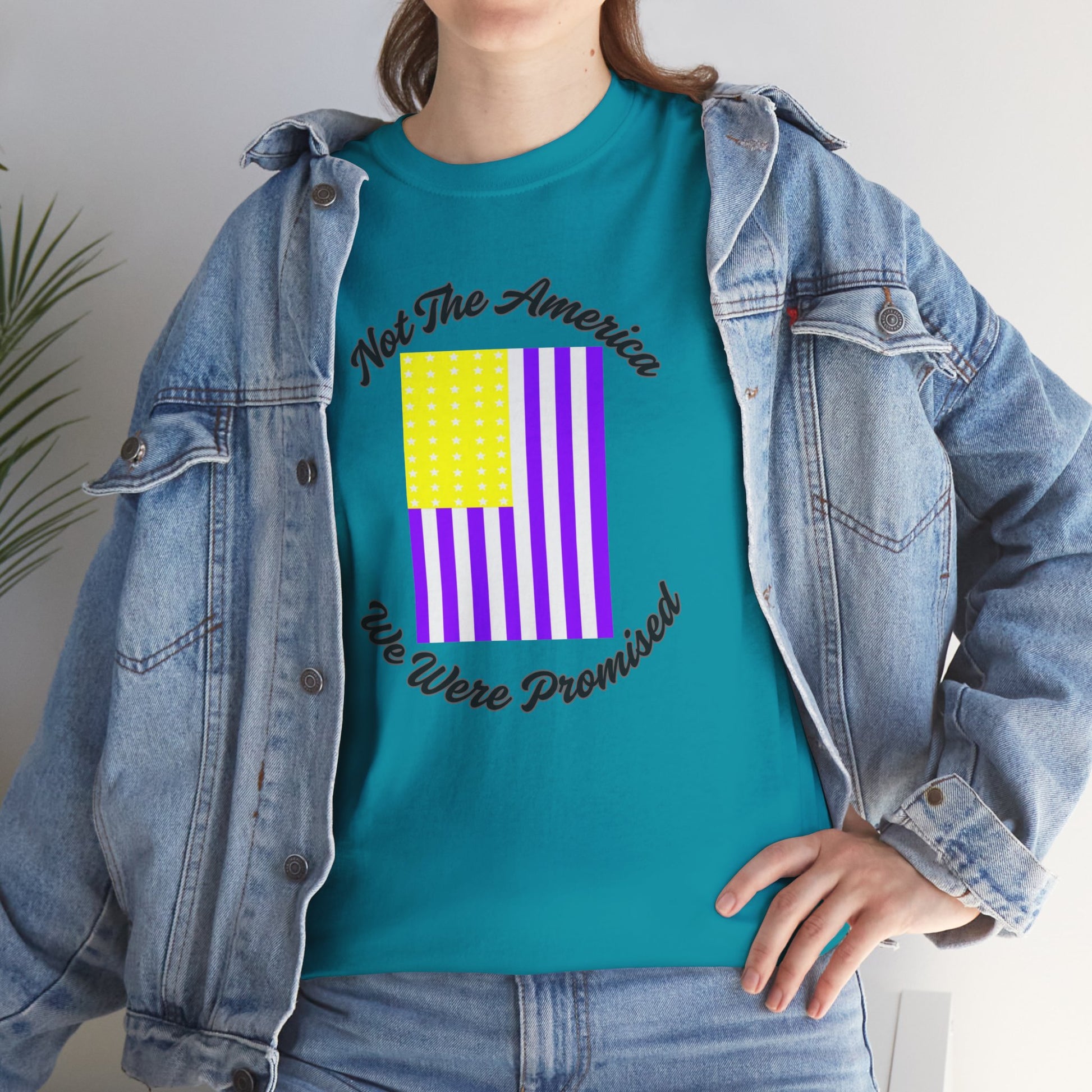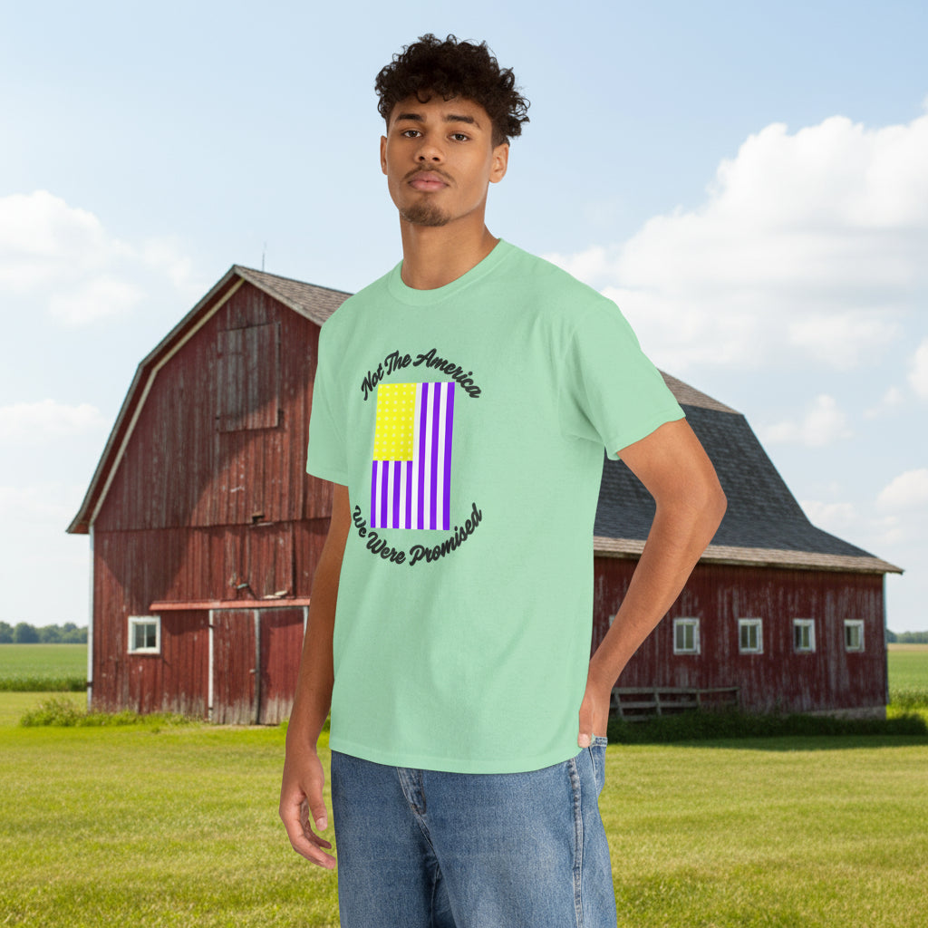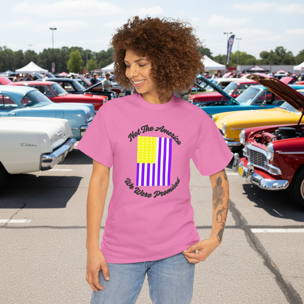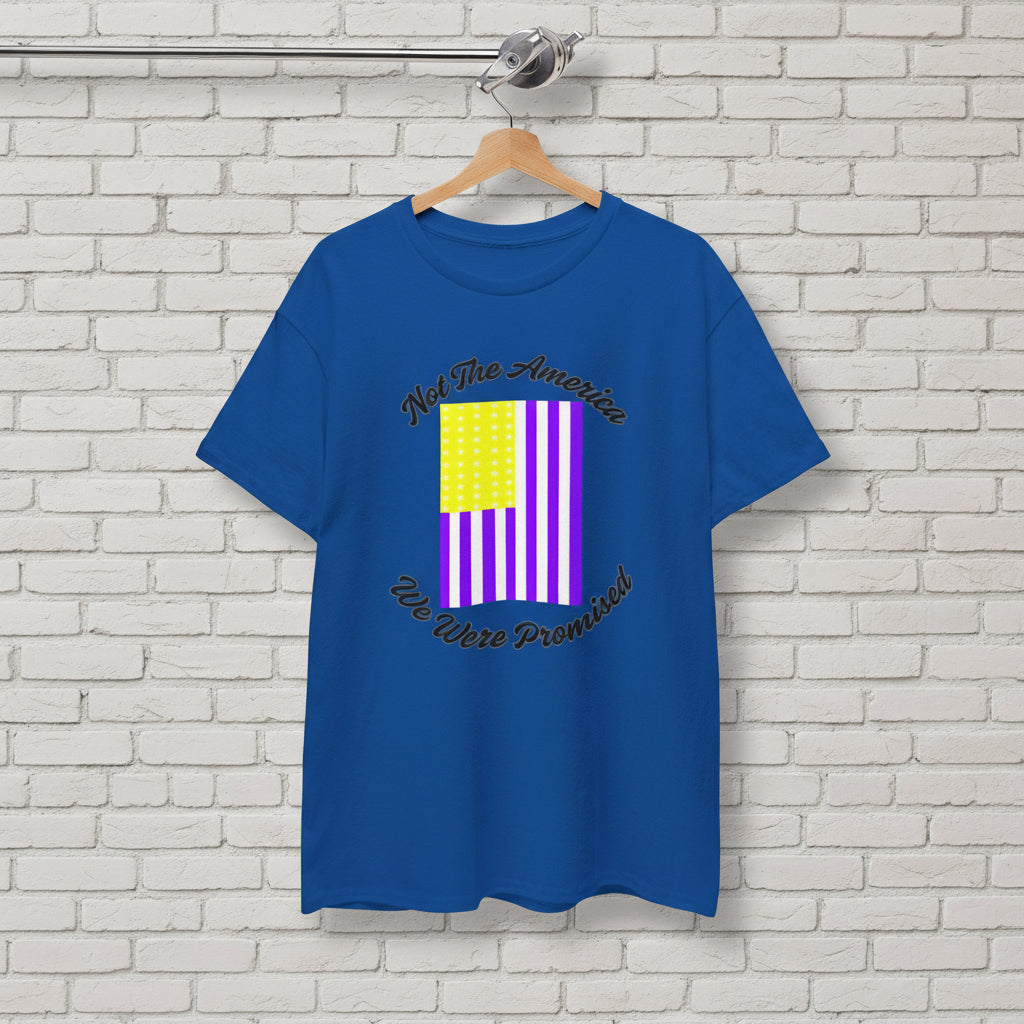 Loud, electric, and unapologetically real. This neon-drenched design screams disillusionment with a dream deferred. 'Not the America We Were Promised' is a fluorescent wake-up call—where bold colors meet bold truth