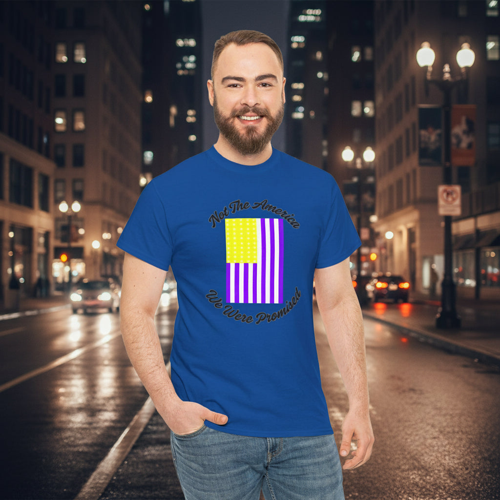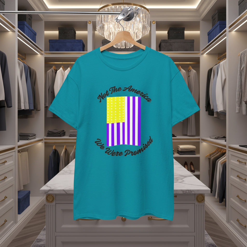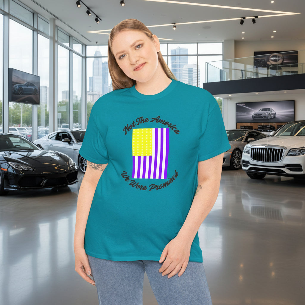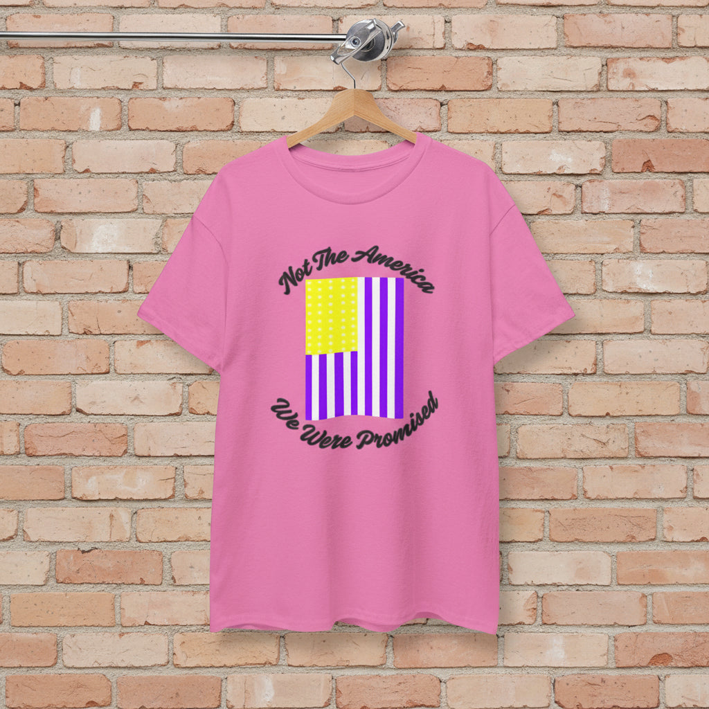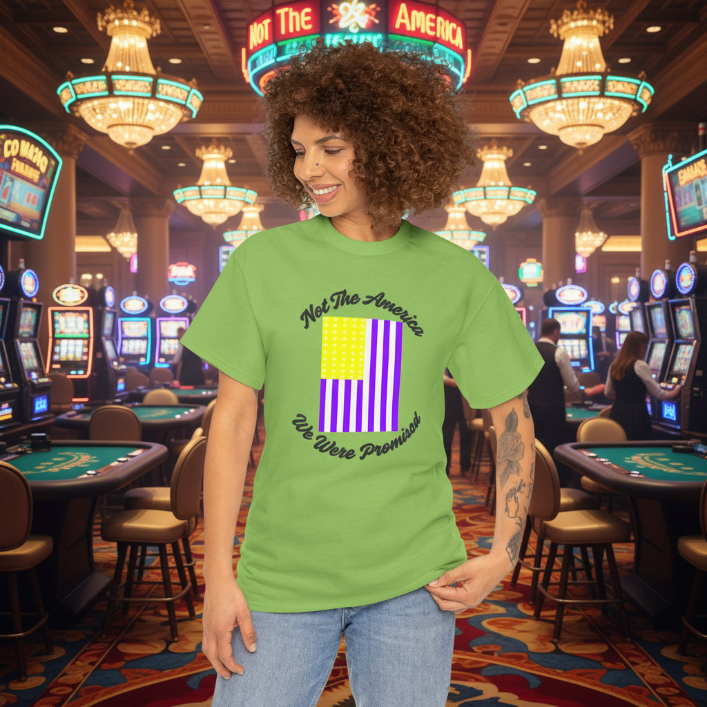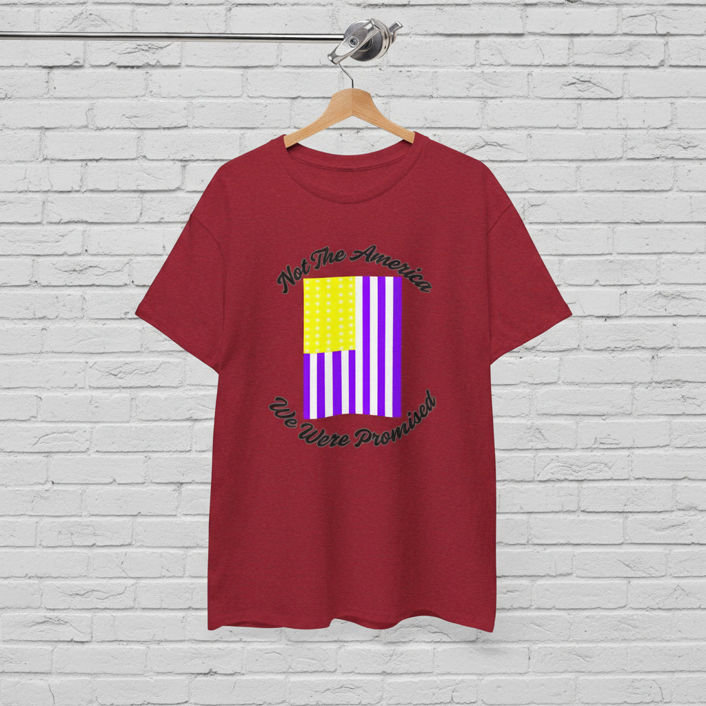 Loud, electric, and unapologetically real. This neon-drenched design screams disillusionment with a dream deferred. 'Not the America We Were Promised' is a fluorescent wake-up call—where bold colors meet bold truth