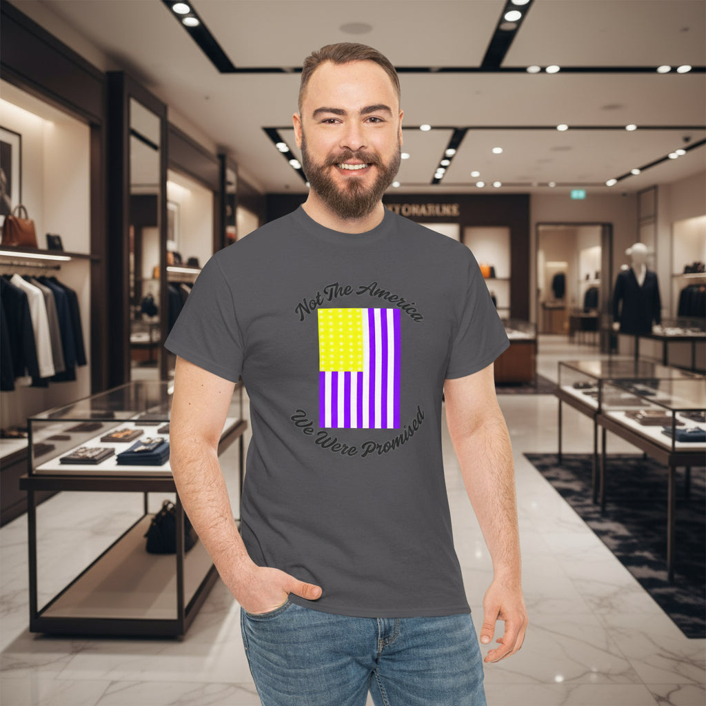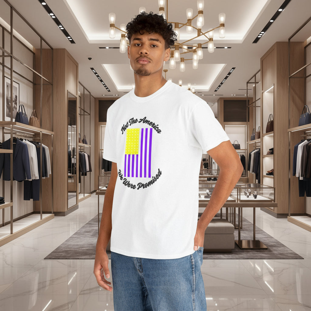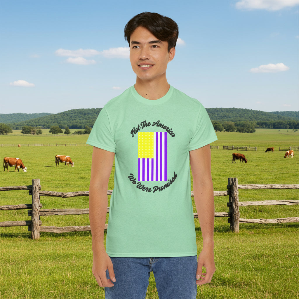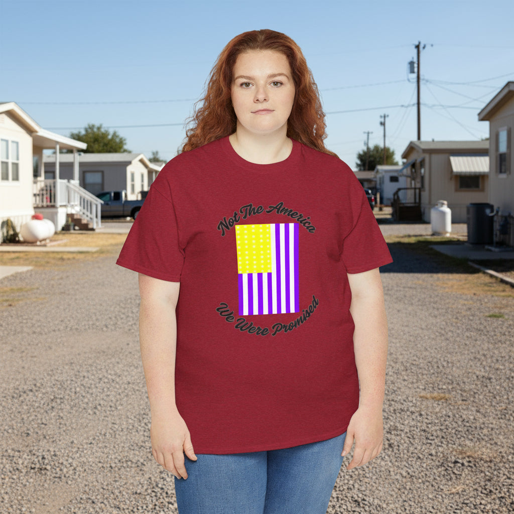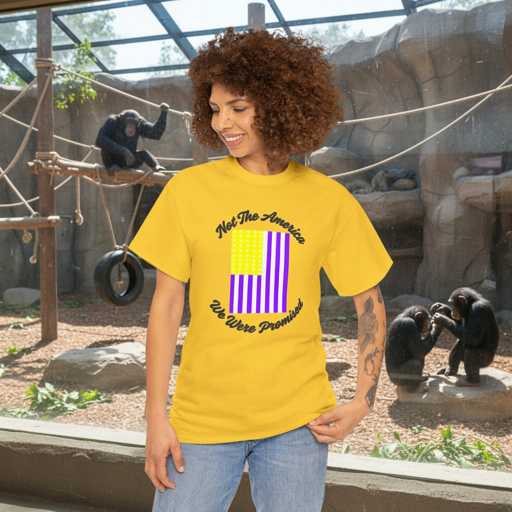 Loud, electric, and unapologetically real. This neon-drenched design screams disillusionment with a dream deferred. 'Not the America We Were Promised' is a fluorescent wake-up call—where bold colors meet bold truth