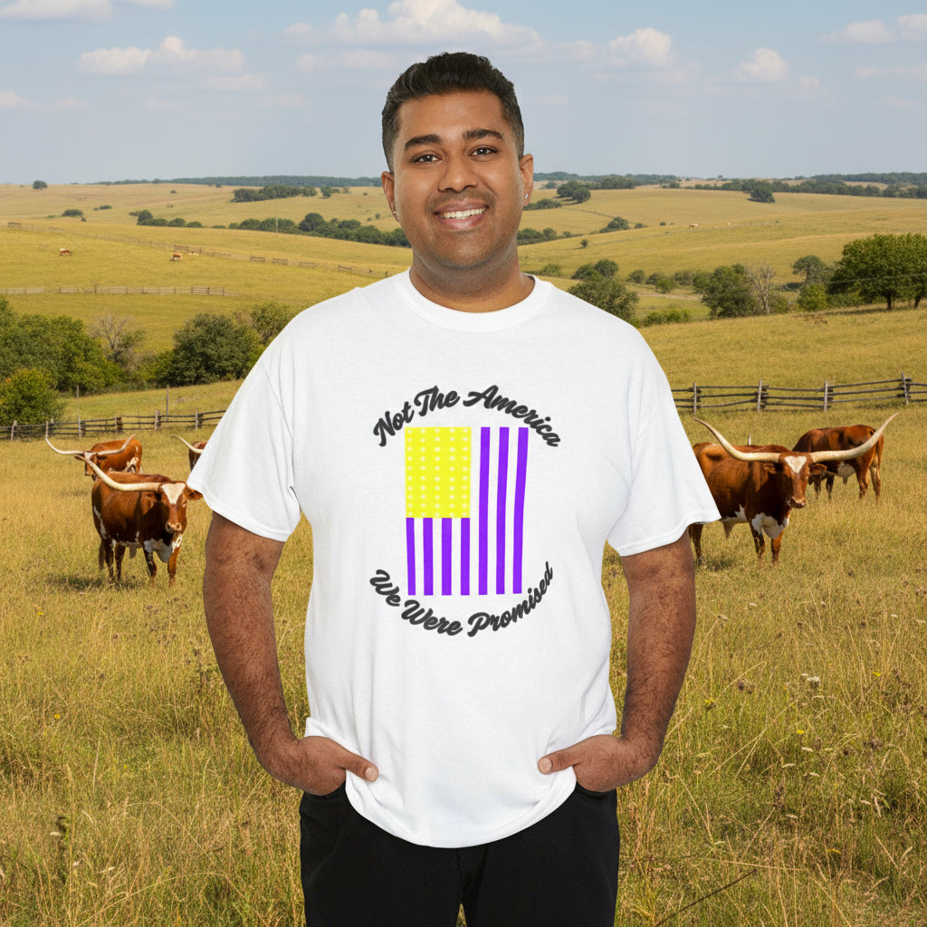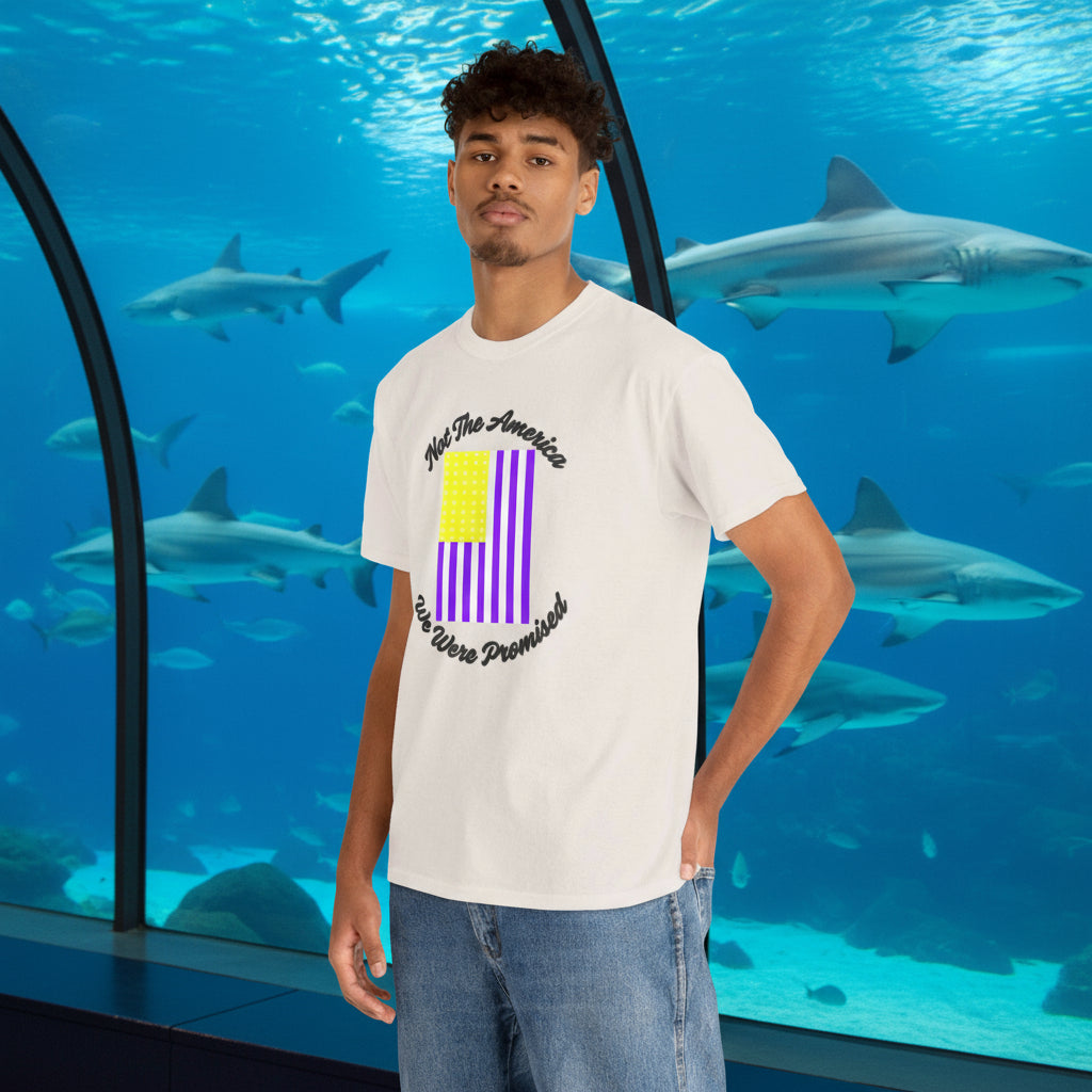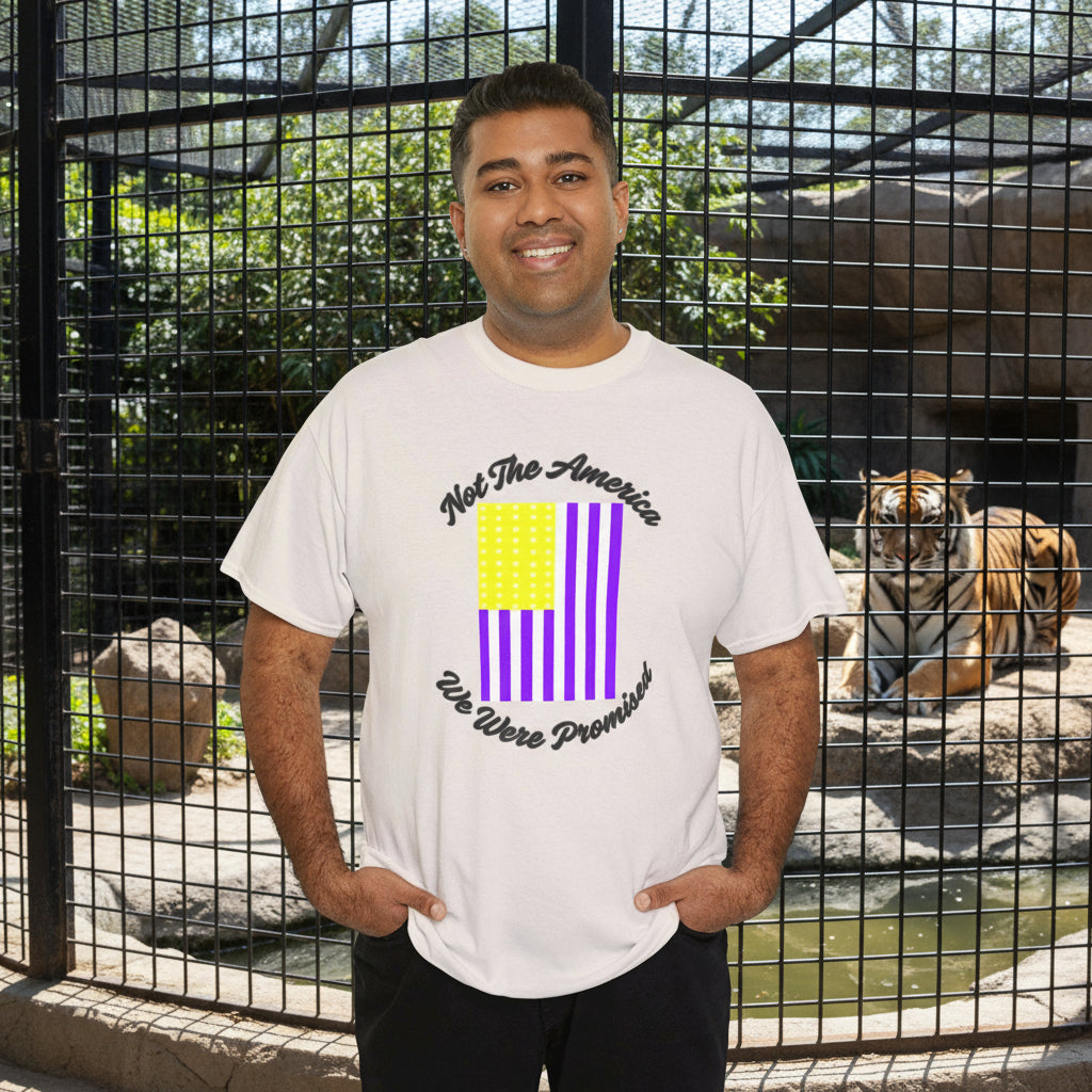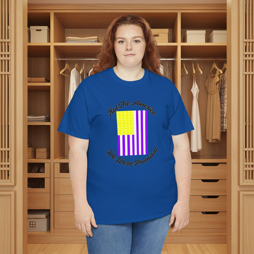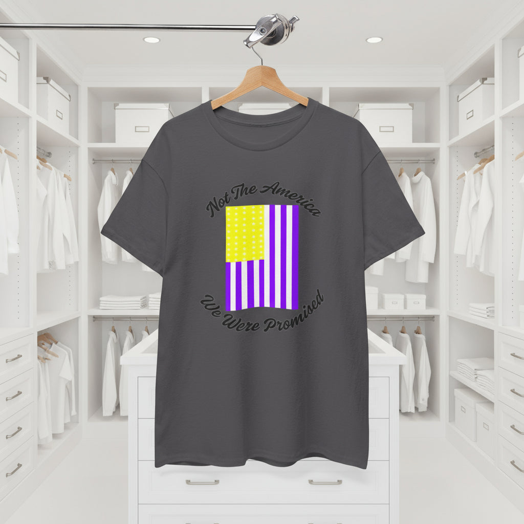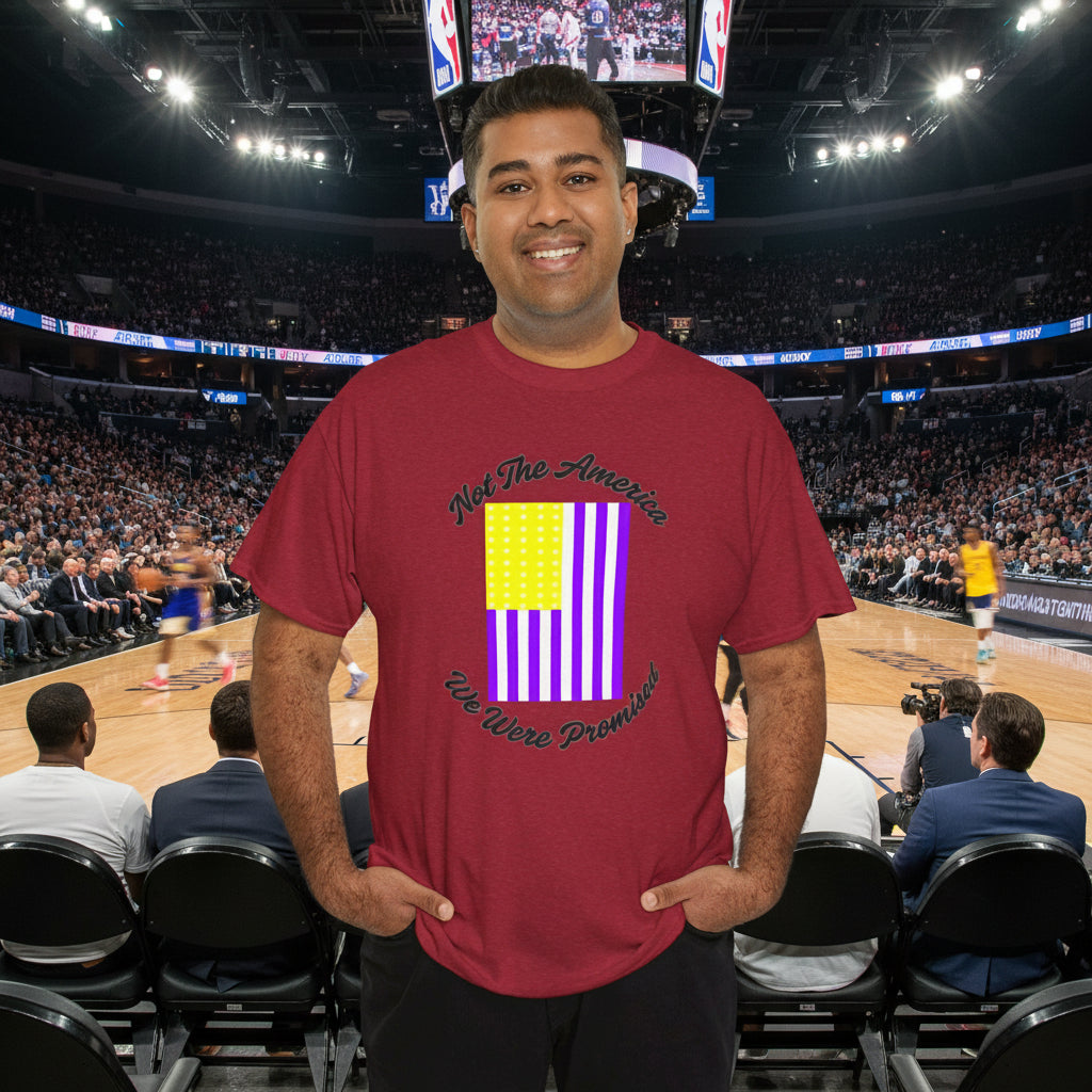 Loud, electric, and unapologetically real. This neon-drenched design screams disillusionment with a dream deferred. 'Not the America We Were Promised' is a fluorescent wake-up call—where bold colors meet bold truth