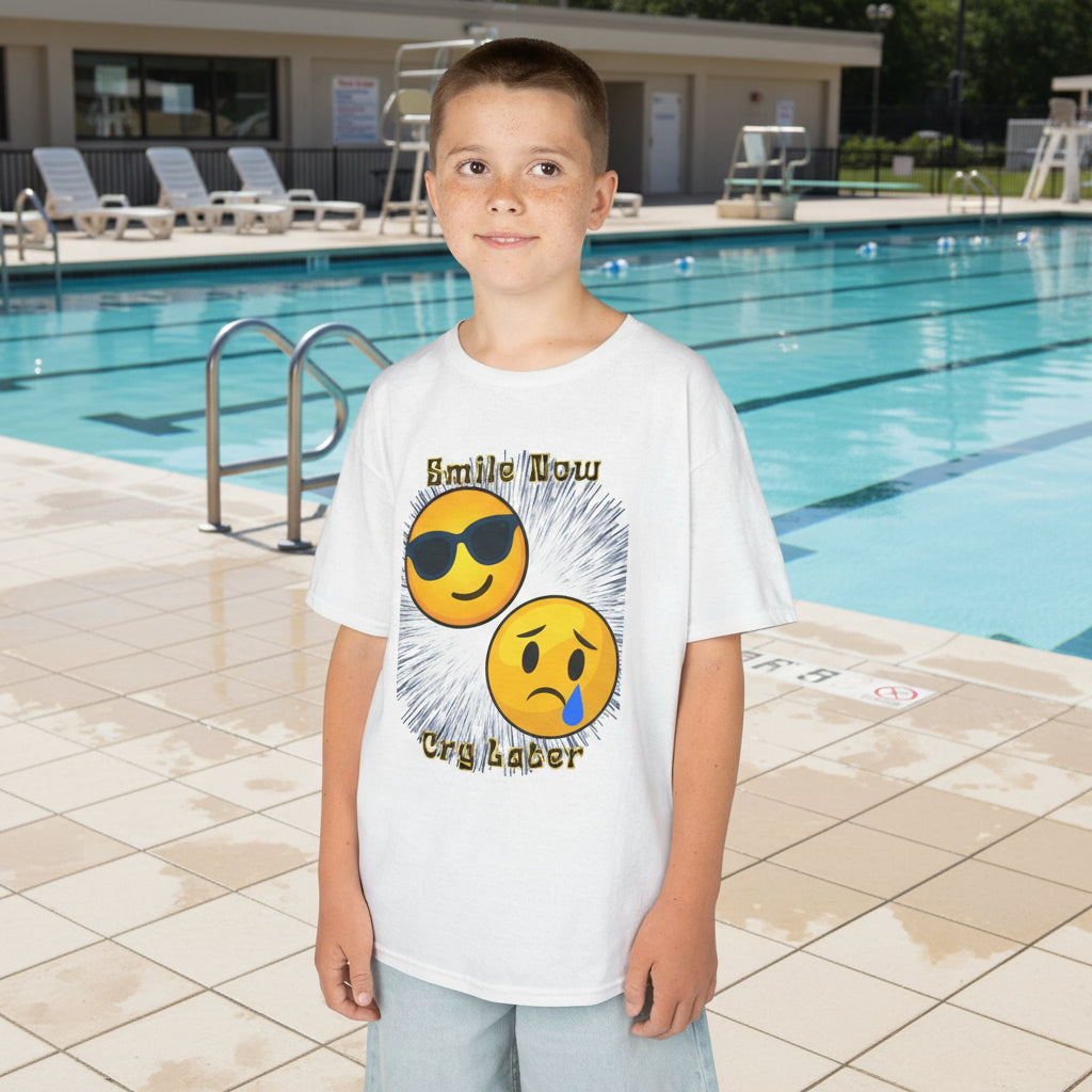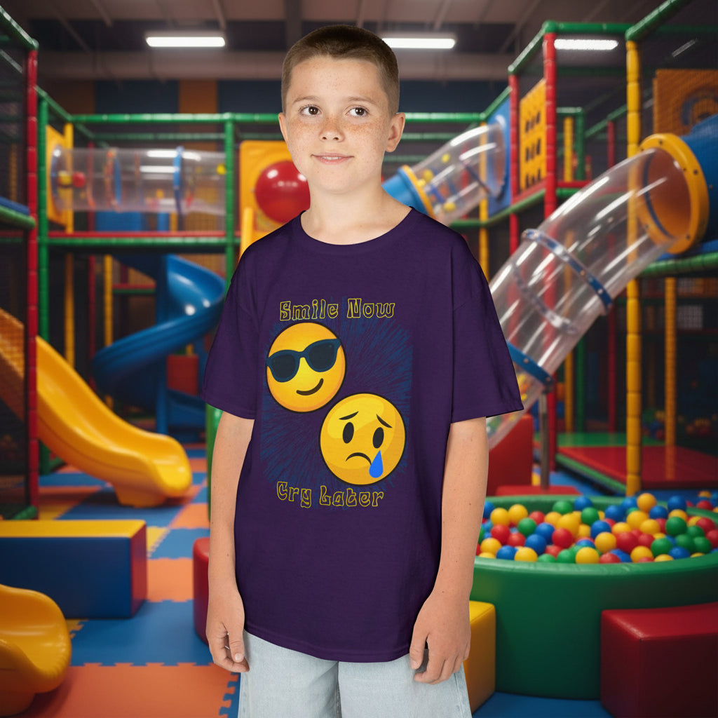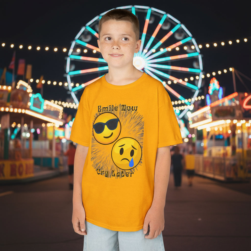 A new take on a classic smile now cry later emoji version, this T-Shirt offers a fun and youthful vibe. This tee can be a playful addition to any kids wardrobe.