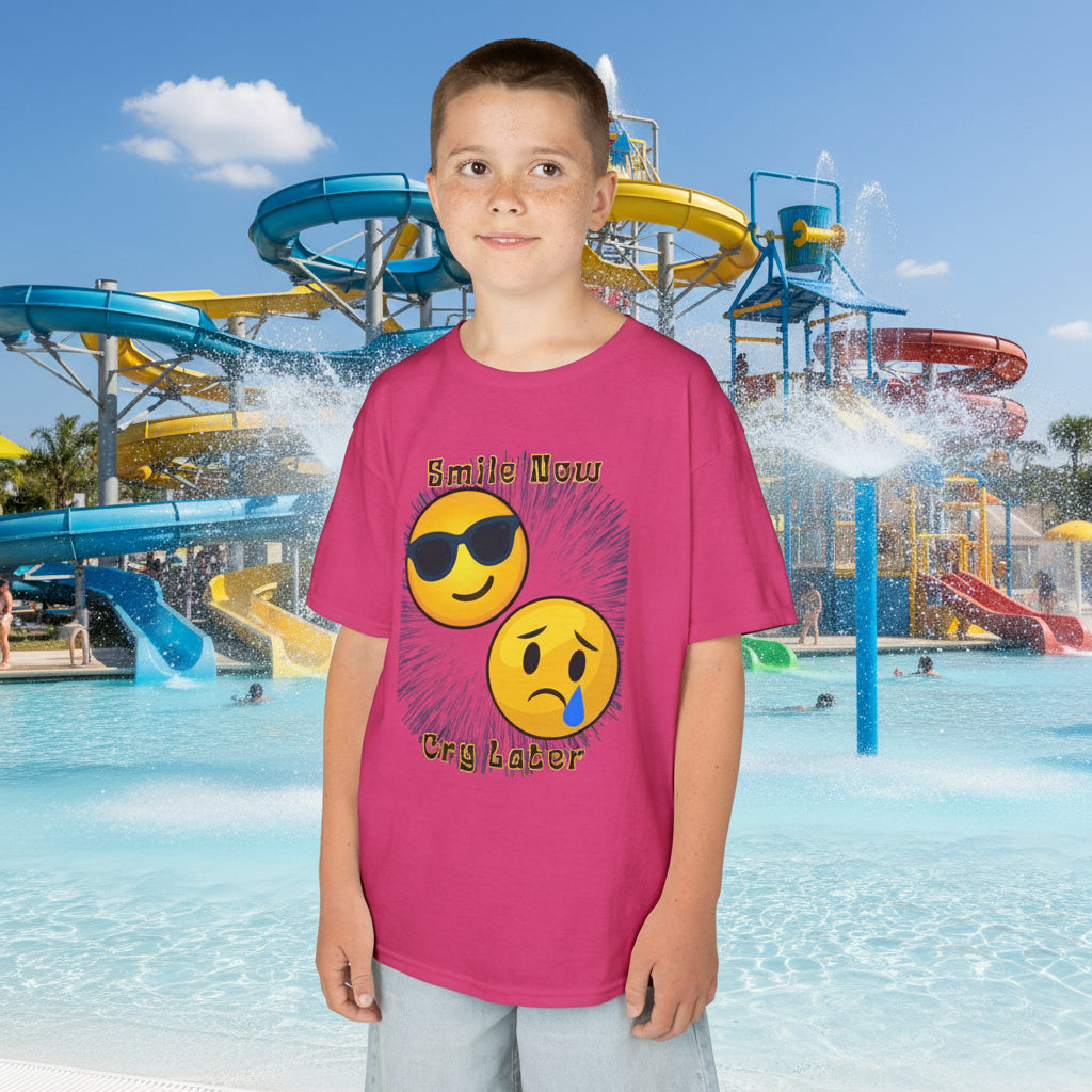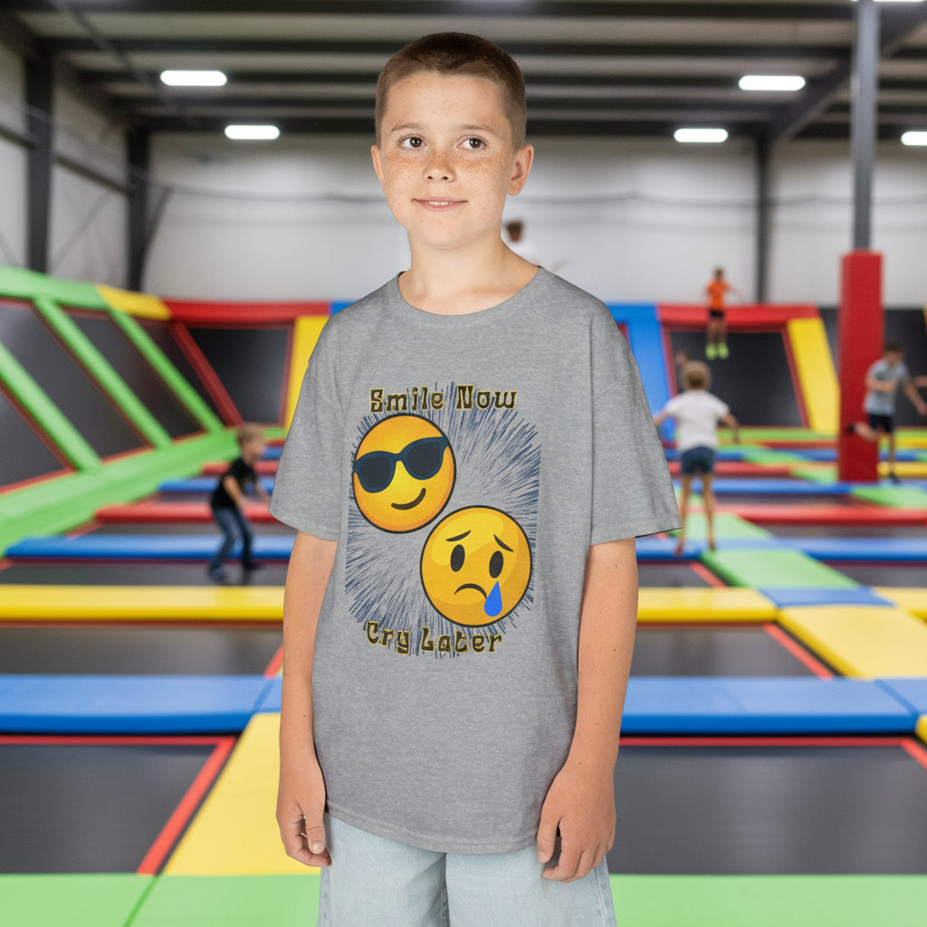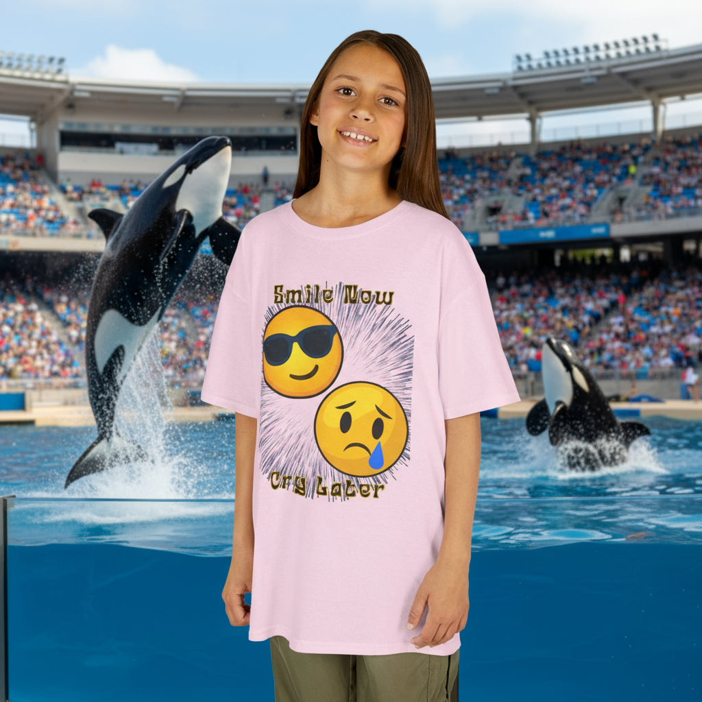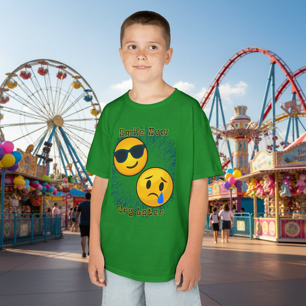 A new take on a classic smile now cry later emoji version, this T-Shirt offers a fun and youthful vibe. This tee can be a playful addition to any kids wardrobe.
