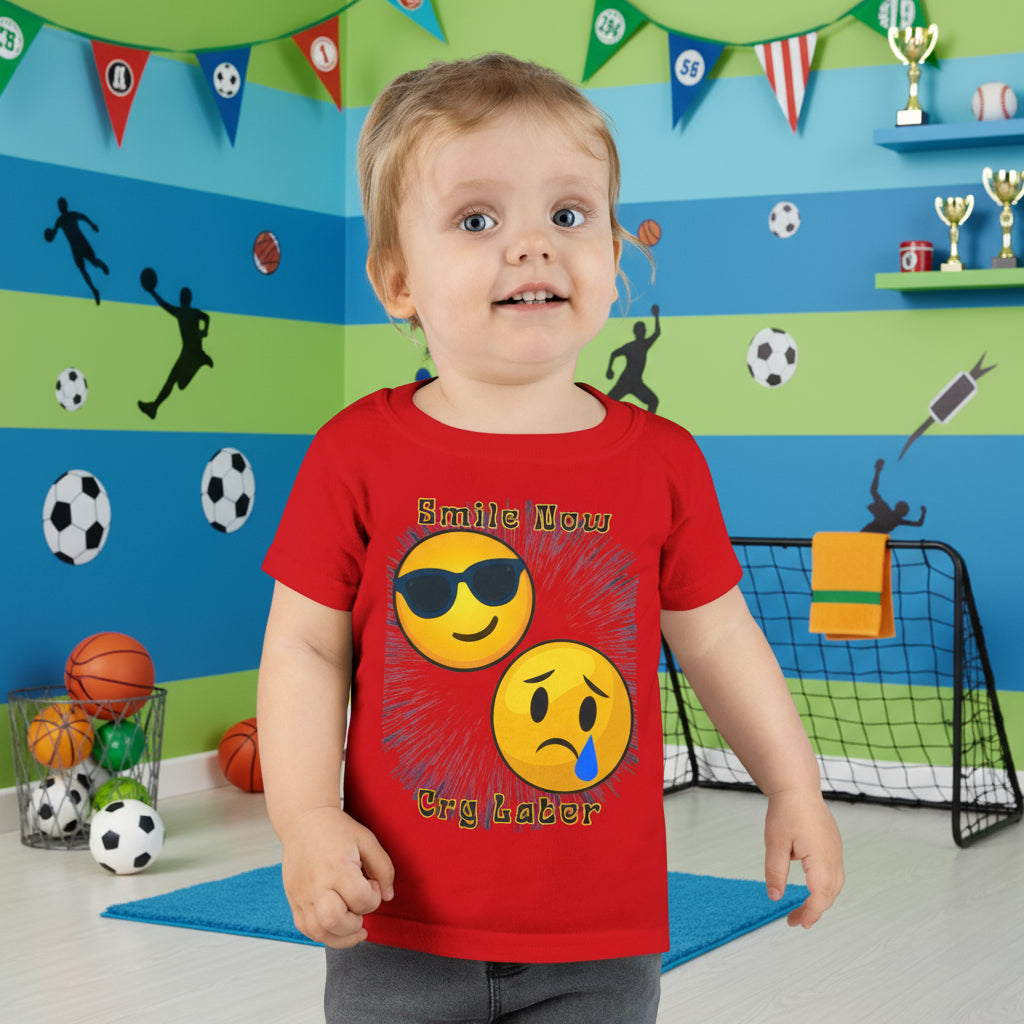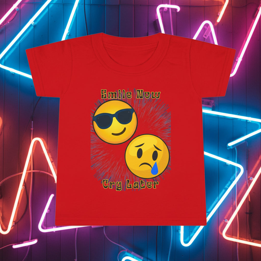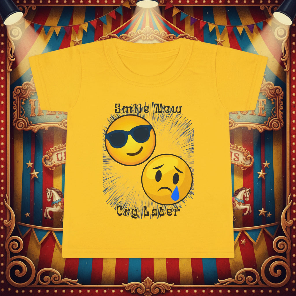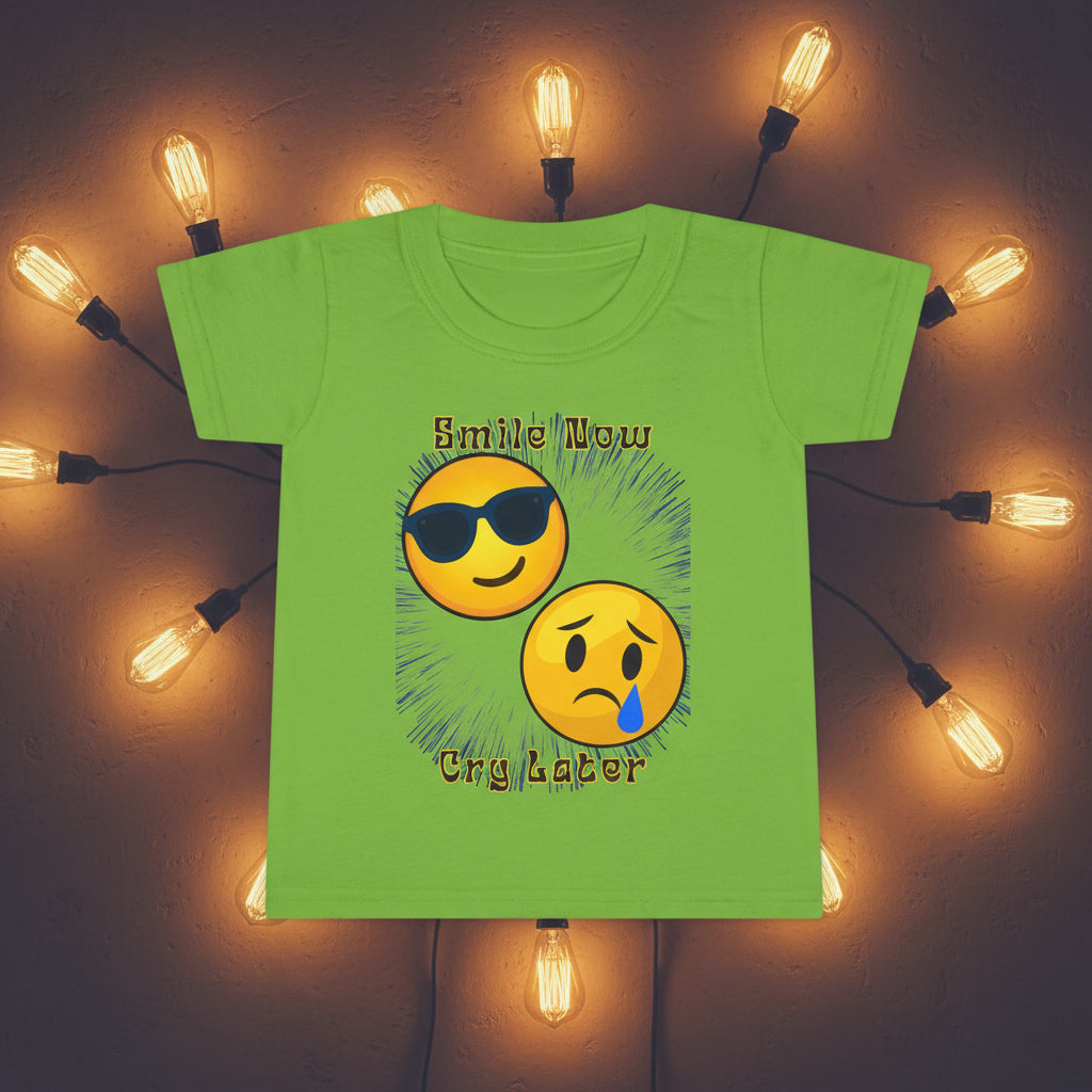 A new take on classic smile now cry later Emoji, this Toddler T-shirt gives off a playful and whimsical vibe. Perfect for young kids who love fun and unique designs. Ideal for birthday parties and casual playdates.